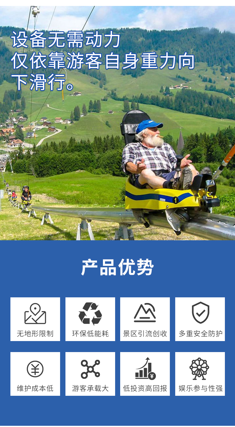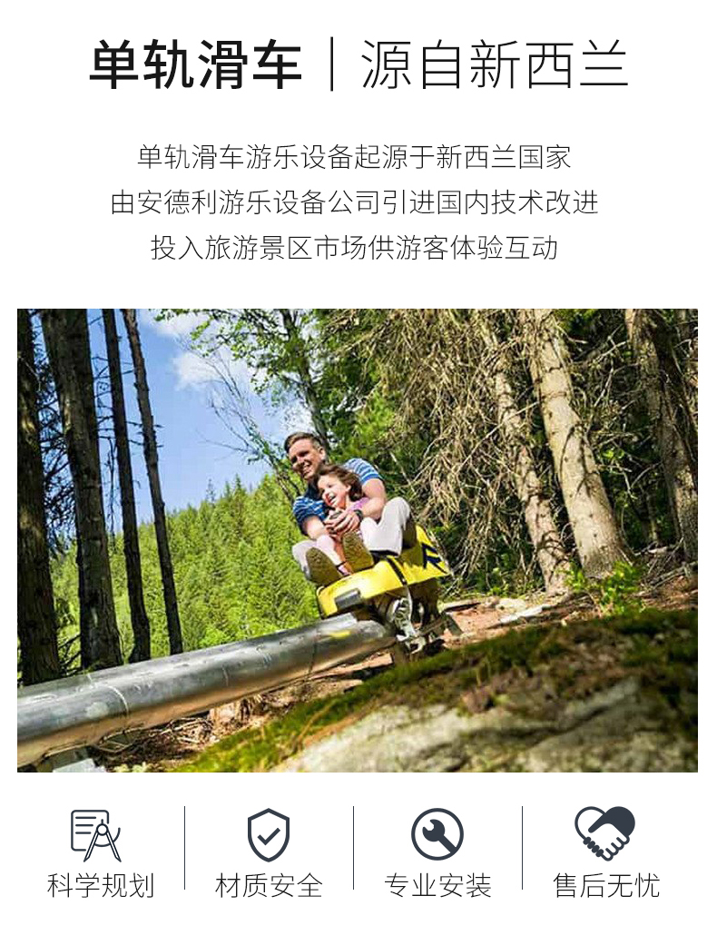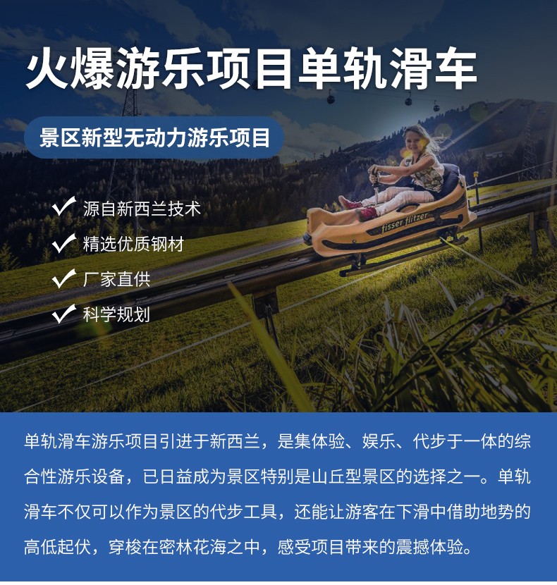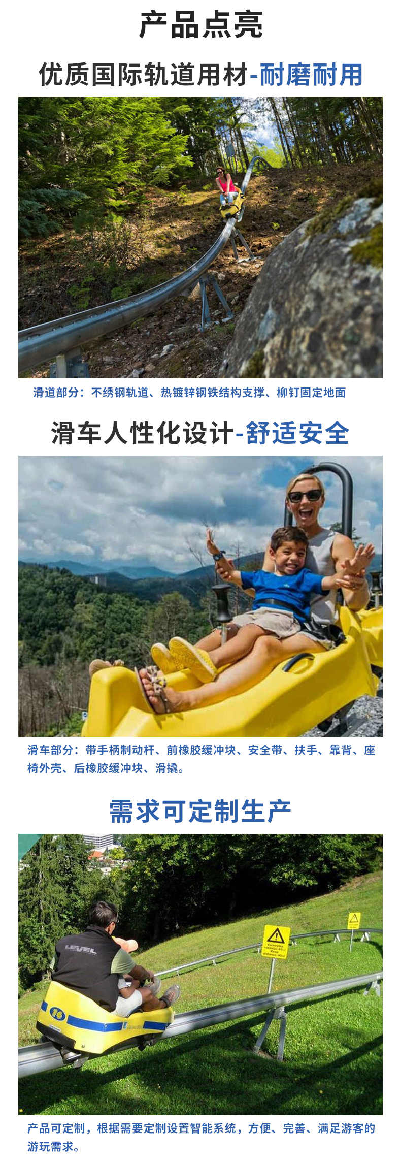 單軌式滑道不僅可以作為景區代步工具、還能讓游客在下滑中借助地勢的高低起伏,穿越在密林花海之中,感受項目帶來的震撼體驗,具有參與性的娛樂設施,日益受人們歡迎,是景區中一種投資低、見效快的新型娛樂與代步為一體的娛樂設施。